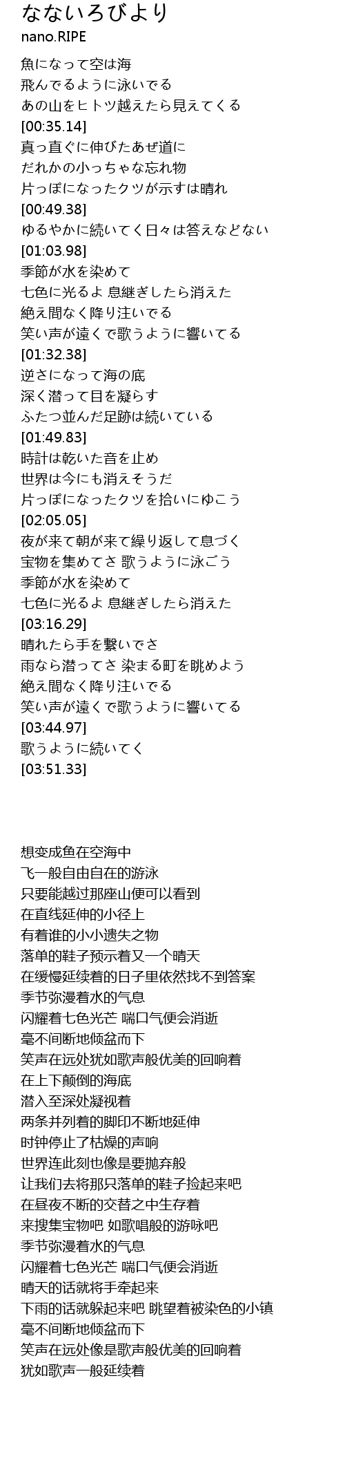 | [03:06.62] | 七色に光るよ 息継ぎしたら消えた |