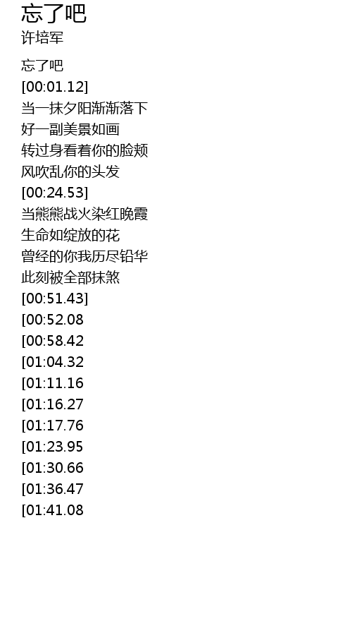 | [02:06.06][00:52.08] | 忘了吧 忘了吧 忘得了吗 |