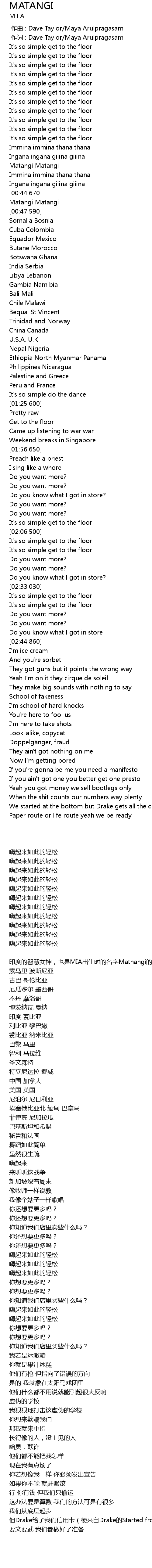 | [00:01.00] | 作词 : Dave Taylor/Maya Arulpragasam |