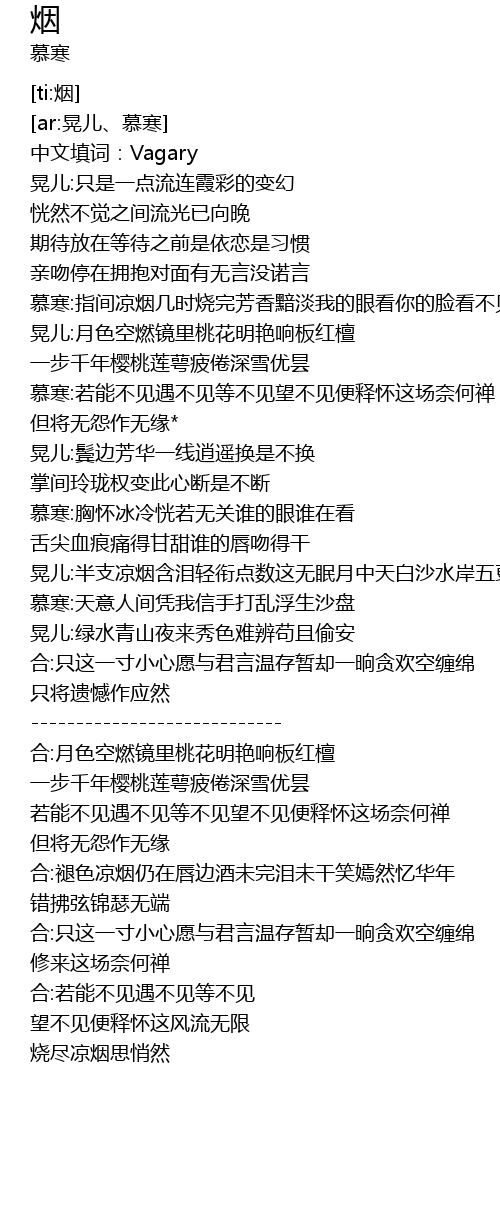| [00:50.790] | 慕寒:指间凉烟几时烧完芳香黯淡我的眼看你的脸看不见 |