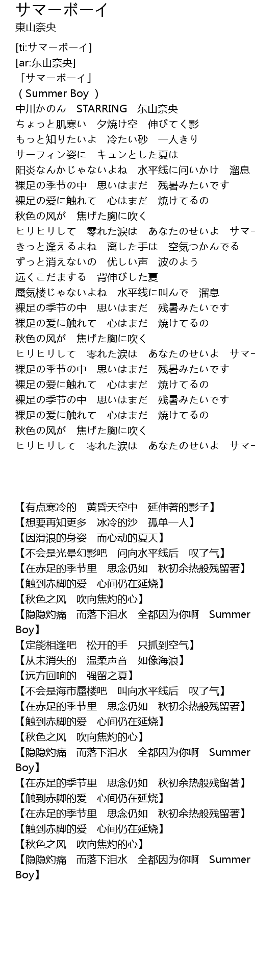 | [03:19.728] | ヒリヒリして 零れた涙は あなたのせいよ サマーボーイ |