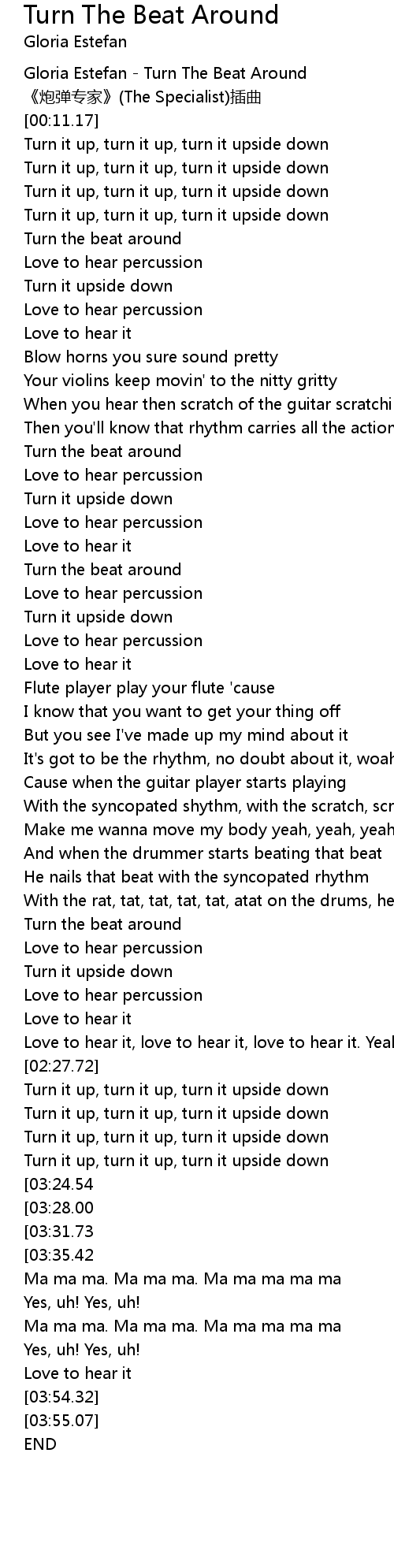 | [00:00.00] | Gloria Estefan - Turn The Beat Around |