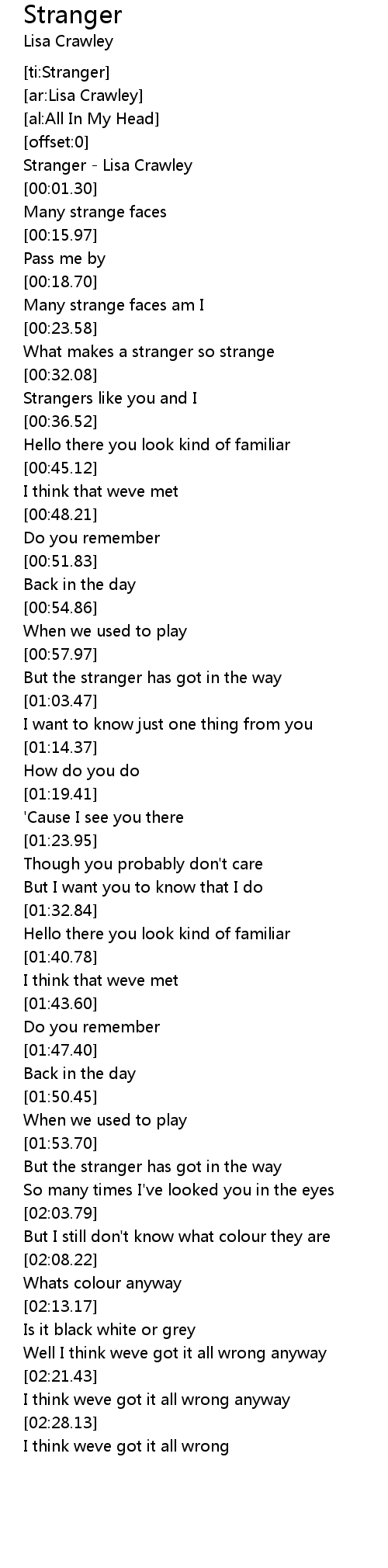 [00:00.50] Stranger - Lisa Crawley