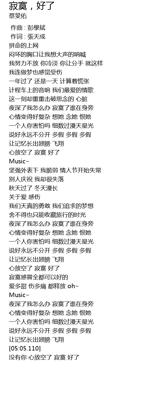 | [05:07.940] | 没有你 心放空了 寂寞 好了 |