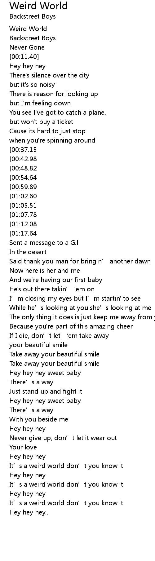 | [01:47.60][00:37.15] | It' s a weird world don' t you know it? |