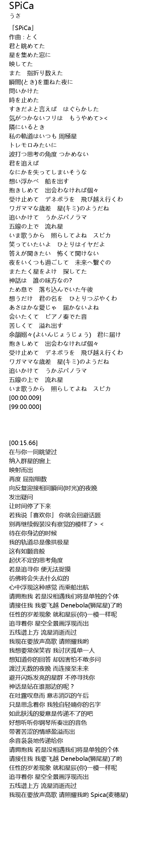 | [03:08.52] | いま歌うから 照らしてよね スピカ |