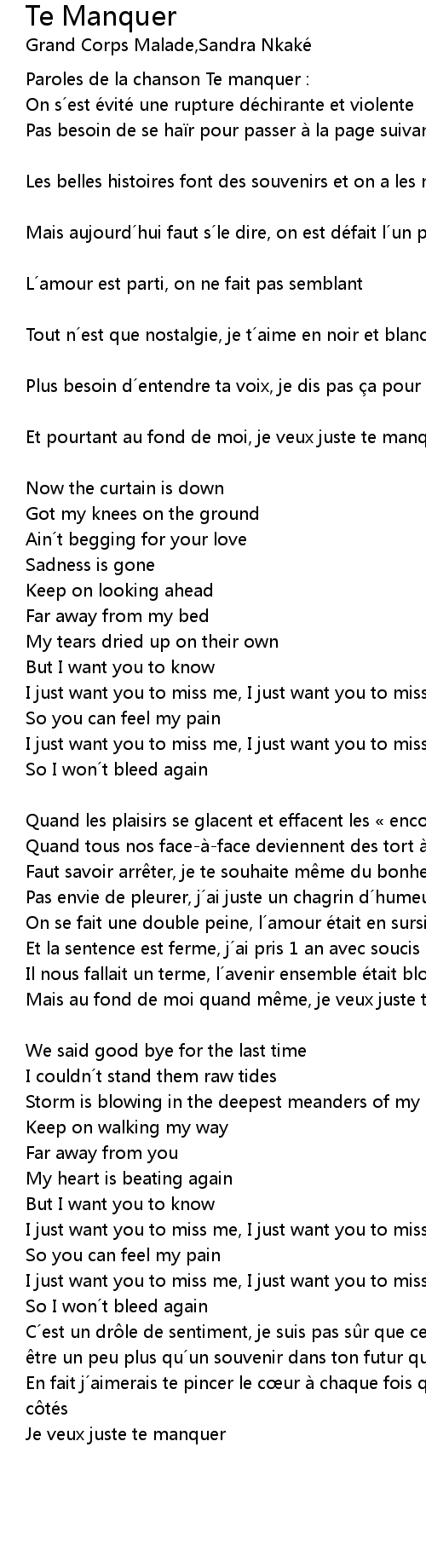 | Mais au fond de moi quand m me, je veux juste te manquer | |