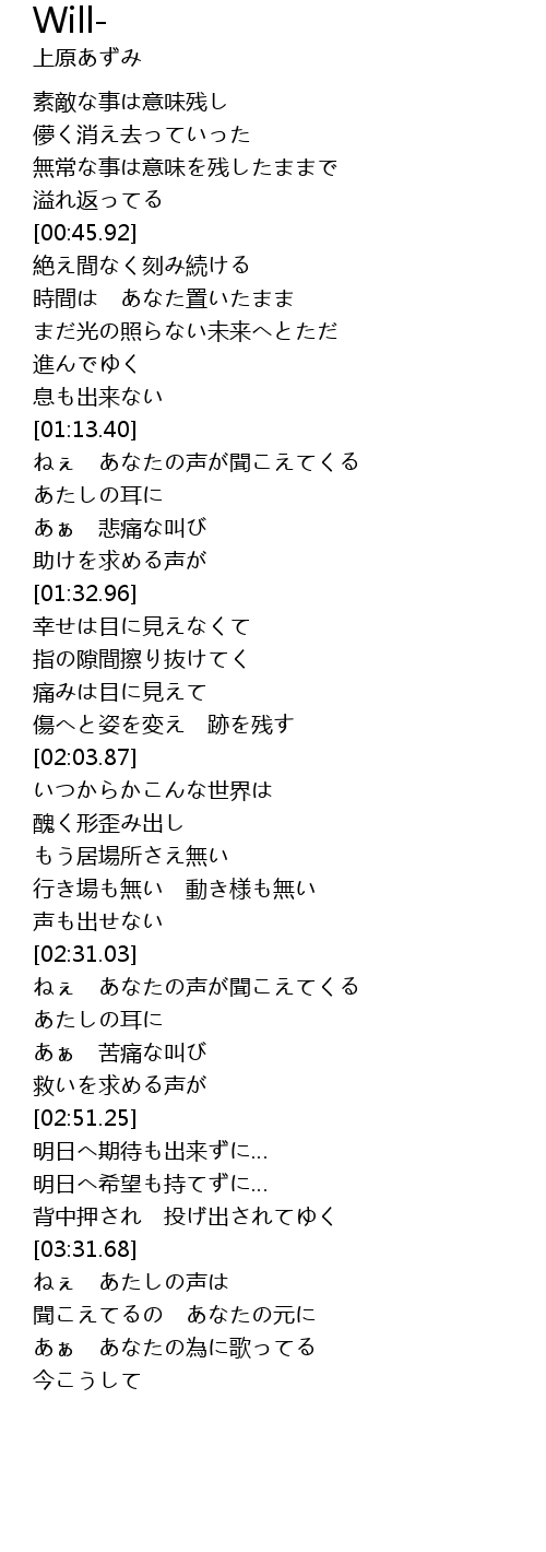 | [03:12.58] | 明日へ期待も出来ずに… |