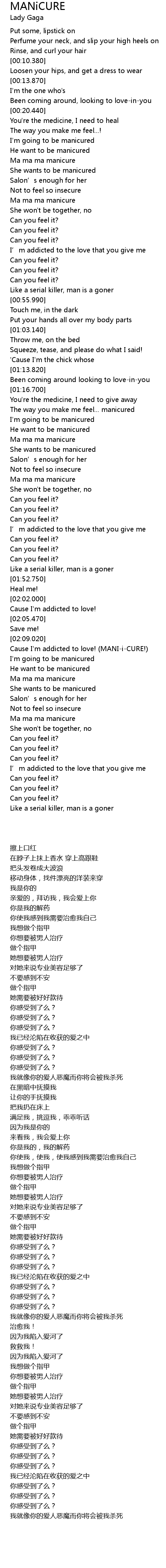 | [02:10.810] | Cause I' m addicted to love! MANIiCURE! |