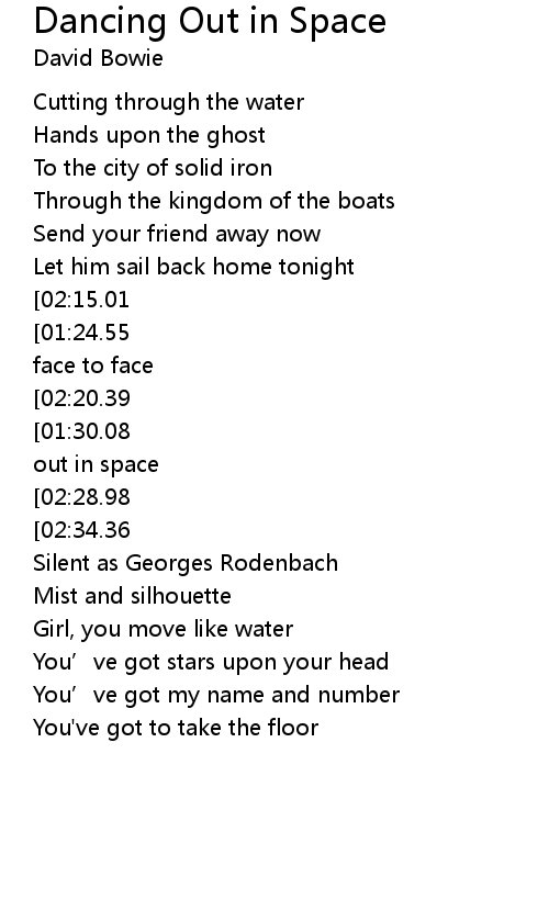 | [01:15.75][01:30.08][02:23.10][02:37.19][02:51.23][03:05.02][03:18.98] | Dancing out in space |