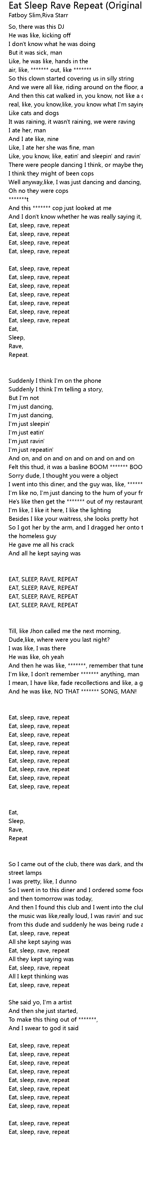 Like, you know, like, eatin' and sleepin' and ravin' repeatin' |