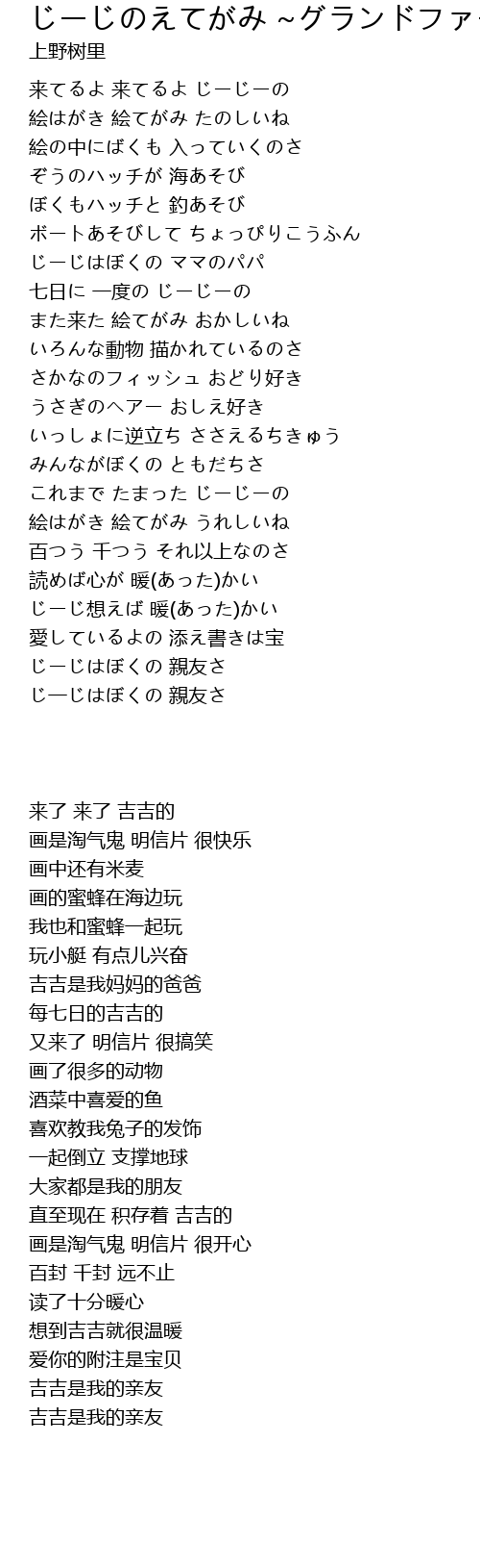 | [00:10.40] | 絵はがき 絵てがみ たのしいね |