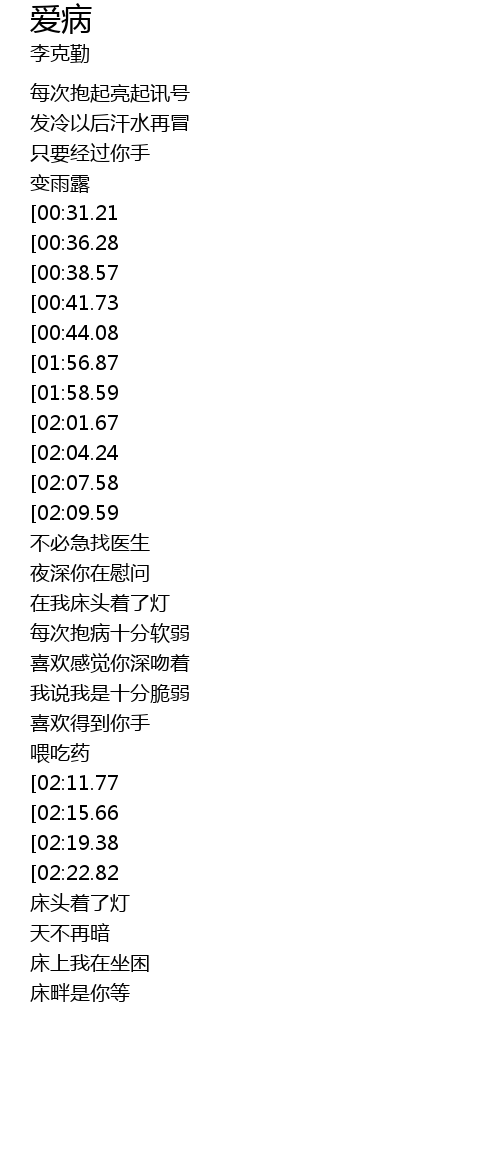 | [03:00.39][02:11.77] | 轻松病人生命能被吻 |
