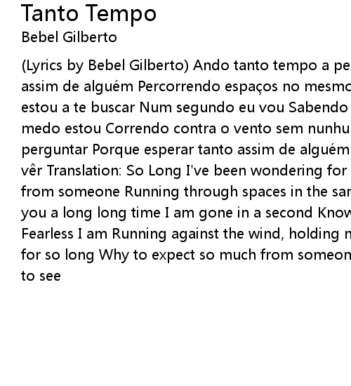 | Lyrics by Bebel Gilberto Ando tanto tempo a perguntar Porque esperar tanto assim de algué m Percorrendo espa os no mesmo lugar N o sei a quanto tempo estou a te buscar Num segundo eu vou Sabendo e percebendo o seu sabor Sem ter medo estou Correndo contra o vento sem nunhum ranc r Ando tanto tempo a perguntar Porque esperar tanto assim de algué m Sem saber Sem qualquer medo de v r Translation: So Long I' ve been wondering for so long Why to expect so much from someone Running through spaces in the same place I' ve been searching for you a long long time I am gone in a second Knowing and learning your taste Fearless I am Running against the wind, holding no grudges I' ve been wondering for so long Why to expect so much from someone Without knowing Without any fear to see |