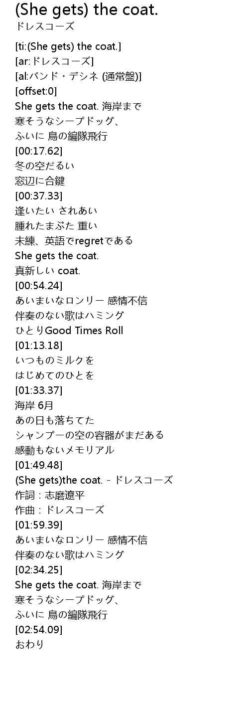 | [01:51.30] | (She gets)the coat. - ドレスコーズ |