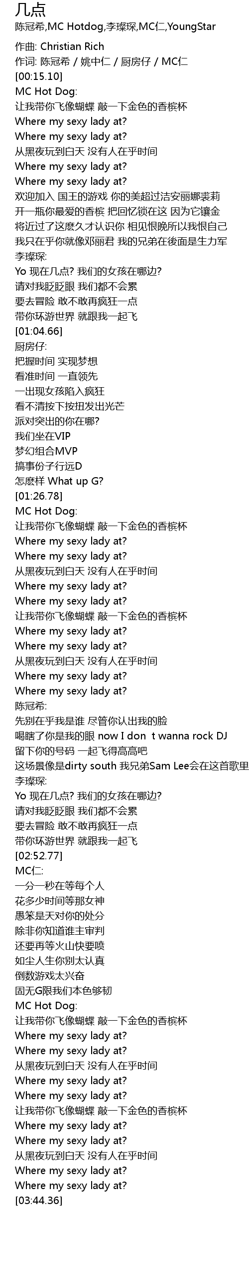 | [00:04.43] | 作词: 陈冠希 / 姚中仁 / 厨房仔 / MC仁 |