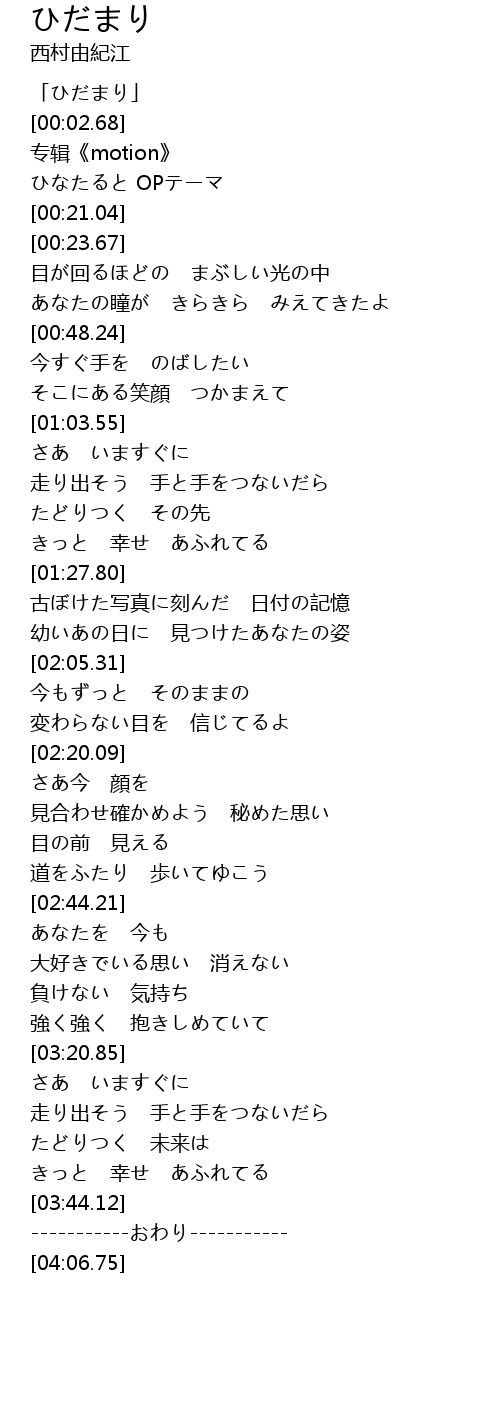 | [03:27.53] | 走り出そう 手と手をつないだら |