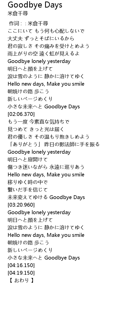 | [01:59.340] | 小さな未来へと Goodbye Days |