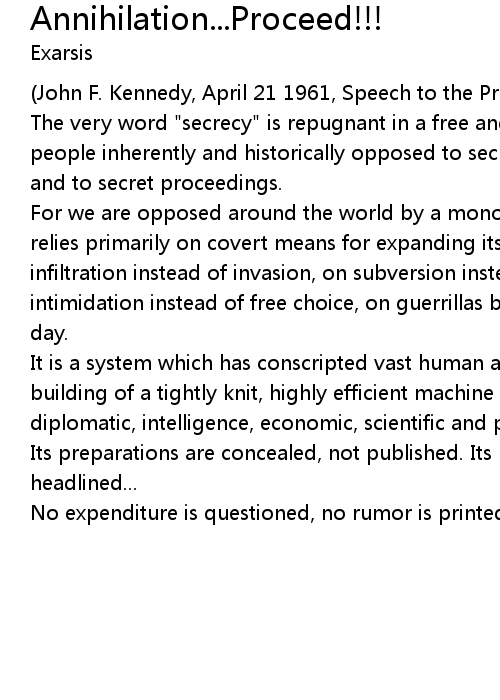 For we are opposed around the world by a monolithic and ruthless conspiracy that relies primarily on covert means for expanding its sphere of influence--on infiltration instead of invasion, on subversion instead of elections, on intimidation instead of free choice, on guerrillas by night instead of armies by day. |