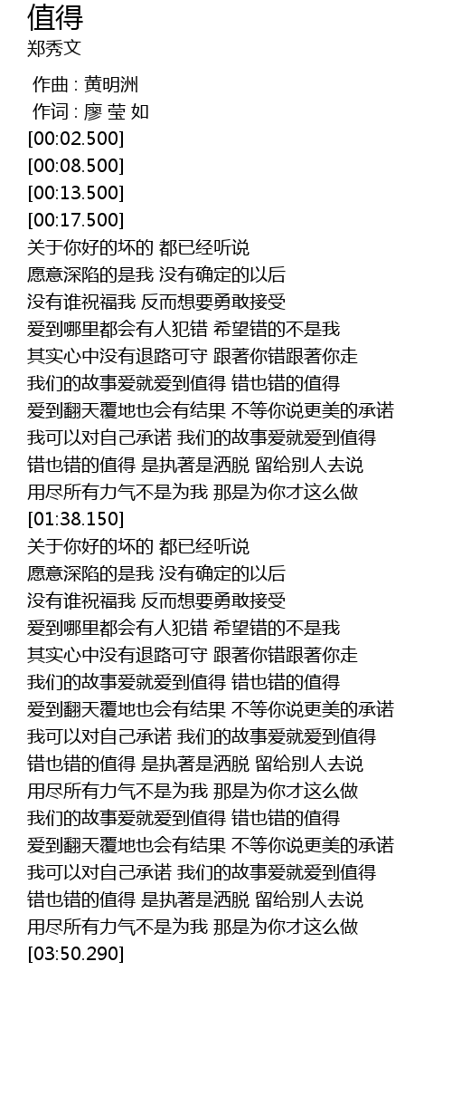 | [02:52.500] | 我可以对自己承诺 我们的故事爱就爱到值得 |