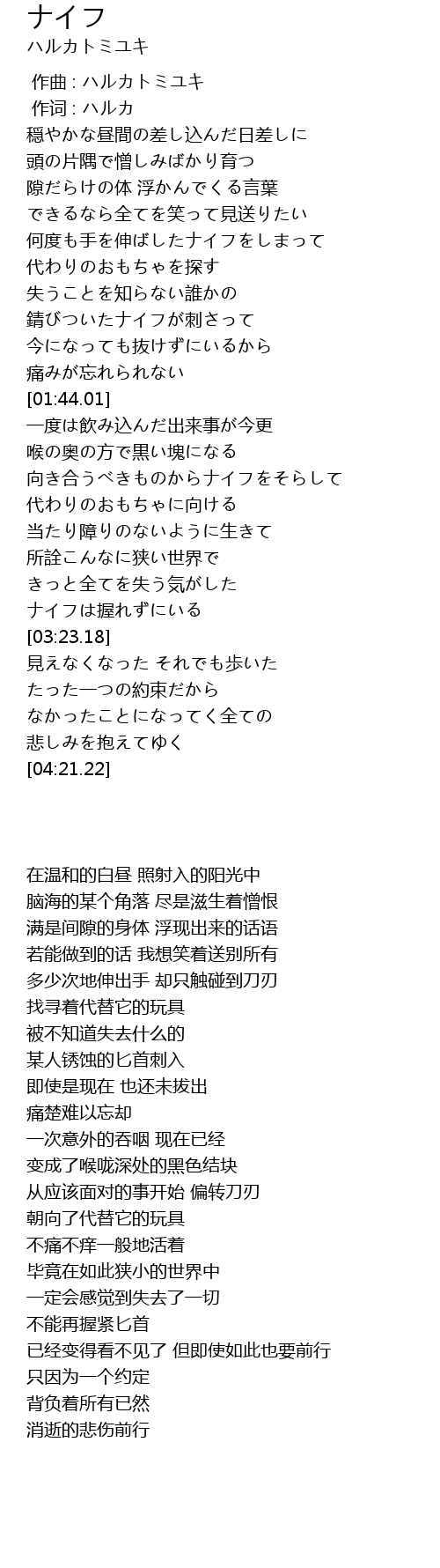 | [00:43.16] | 何度も手を伸ばしたナイフをしまって |