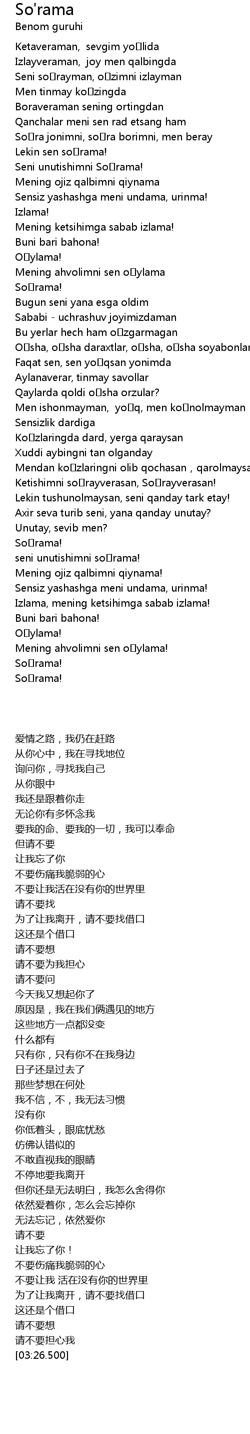 | [00:39.000] | Soʻra jonimni, soʻra borimni, men beray |