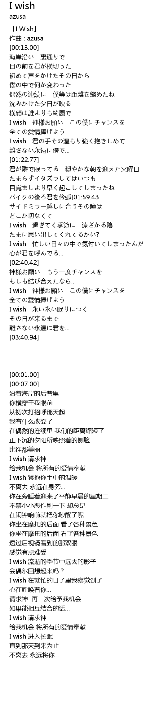 | [00:55.74] | I wish 神様お願い この僕にチャンスを |