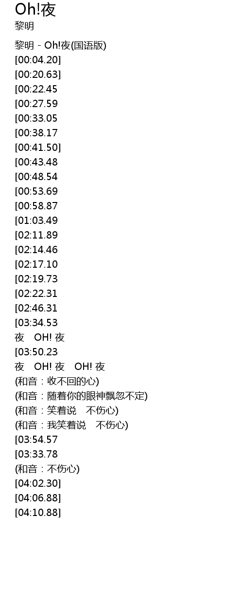 | [03:55.52][03:50.23][03:39.80][03:29.38][02:42.57][02:32.07][01:24.26] | OH! 夜 OH! 夜 OH! 夜 |