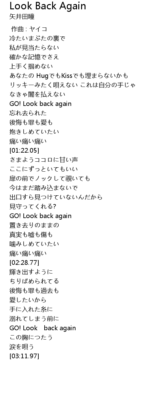 | [00:46.34] | あなたの HugでもKissでも埋まらないかも |