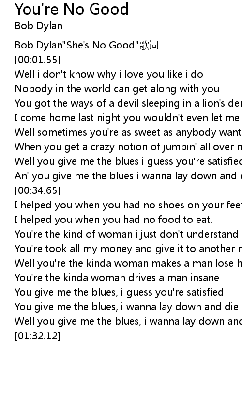 | [00:00.58] | Bob Dylan"She's No Good"歌词 |
