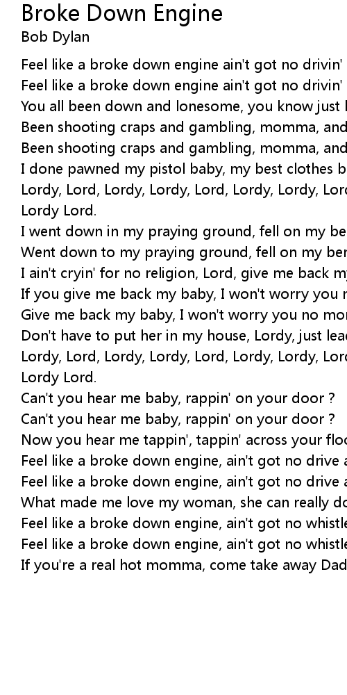 Feel like a broke down engine, ain't got no whistle or bell |