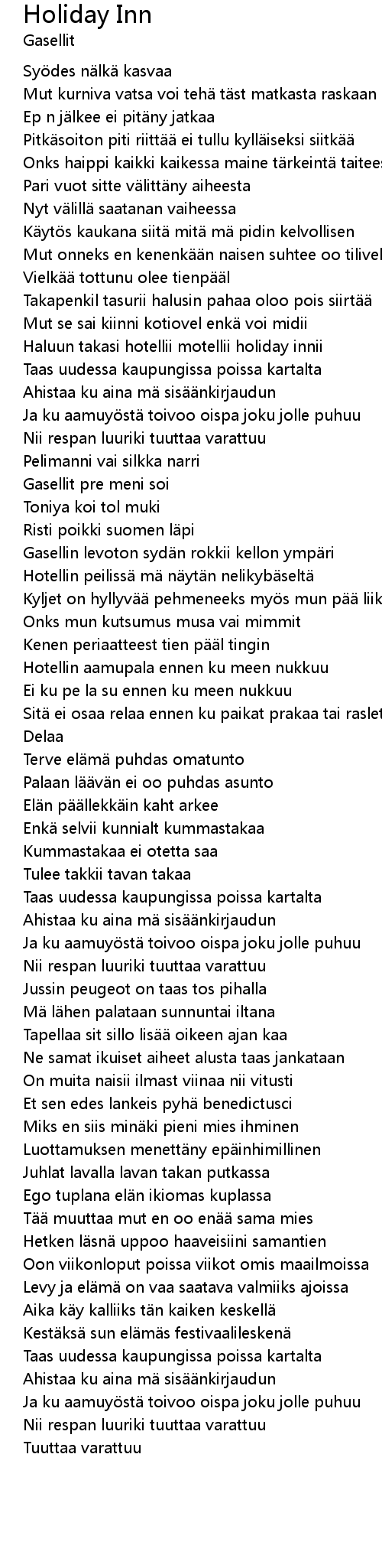 | [00:52.50] | Haluun takasi hotellii motellii holiday innii |