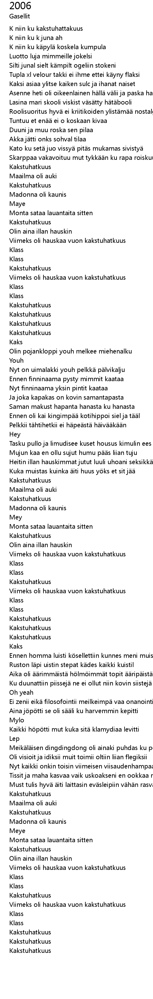| [02:06.84] | Viimeks oli hauskaa vuon kakstuhatkuus |