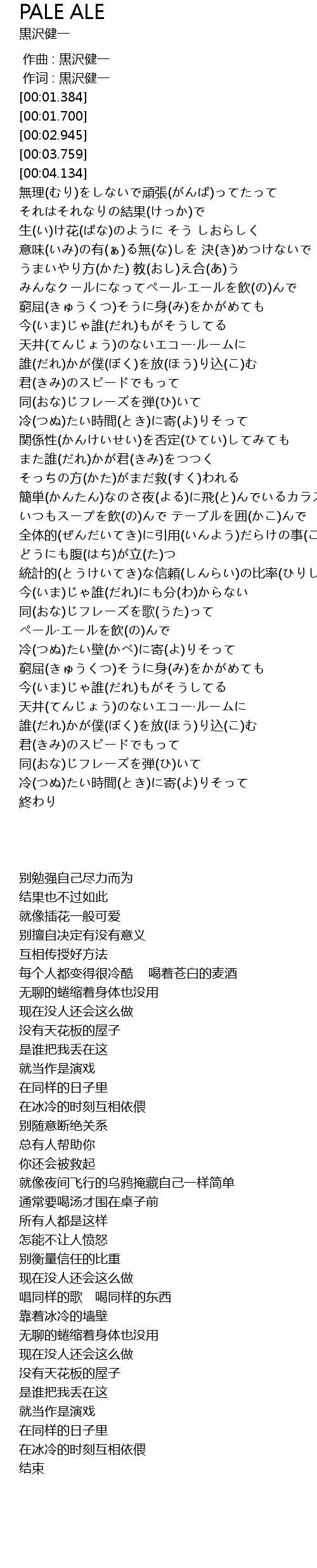 | [00:23.642] | みんなクールになってペール·エールを飲(の)んで |