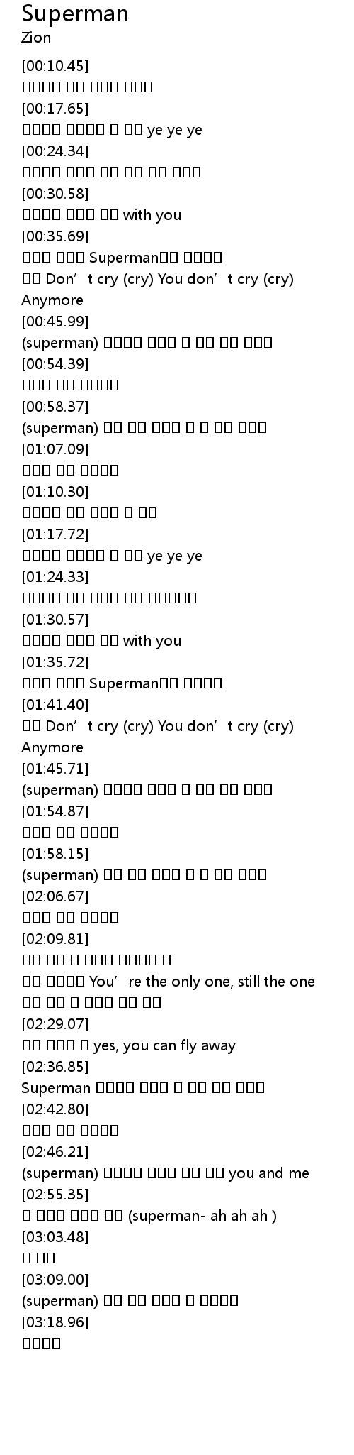 | [02:56.06] | 그 어디쯤 있을지 몰라 (superman- ah ah ah ) |