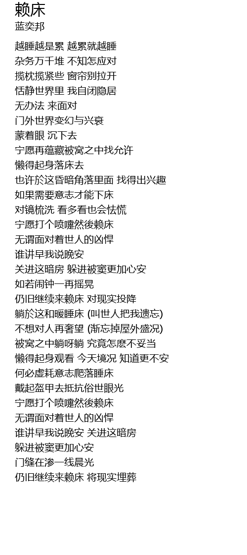 | [02:00.829] | 懒得起身观看 今天境况 知道更不安 |