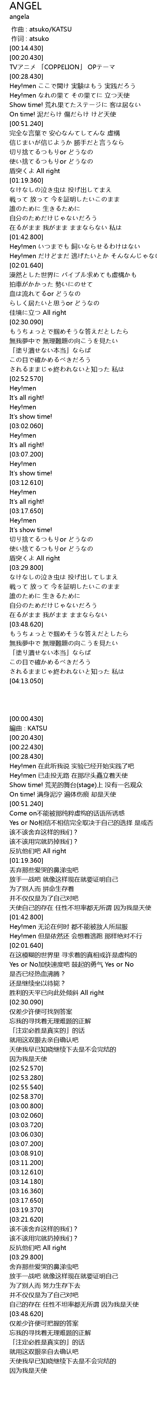 | [04:04.320] | 天使我早已知晓继续下去是不会完结的 因为我是天使 |