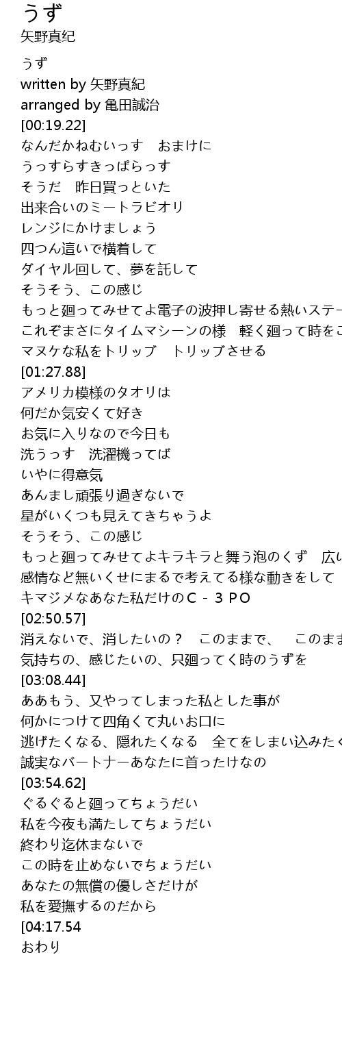 | [02:58.39] | 気持ちの、感じたいの、只廻ってく時のうずを |