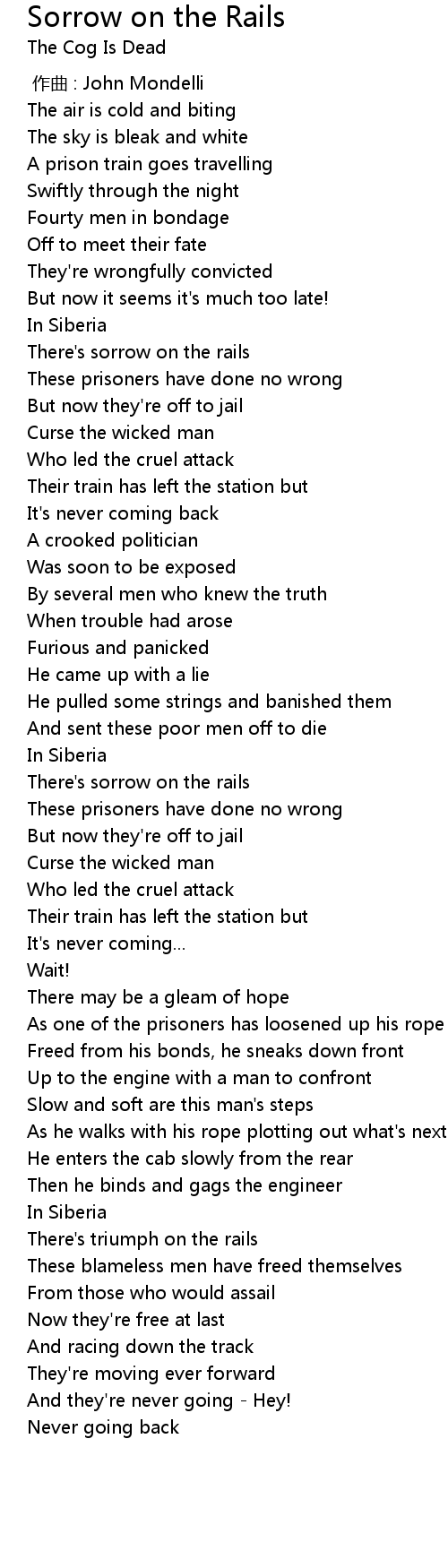 | [00:38.00] | There' s sorrow on the rails |