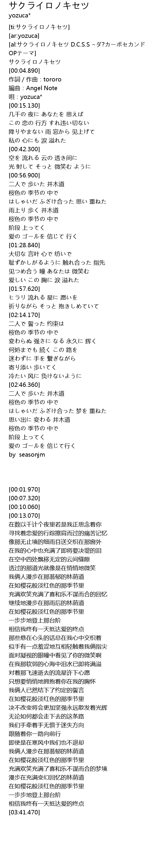 | [02:17.900] | 桜色の 季节の 中で |