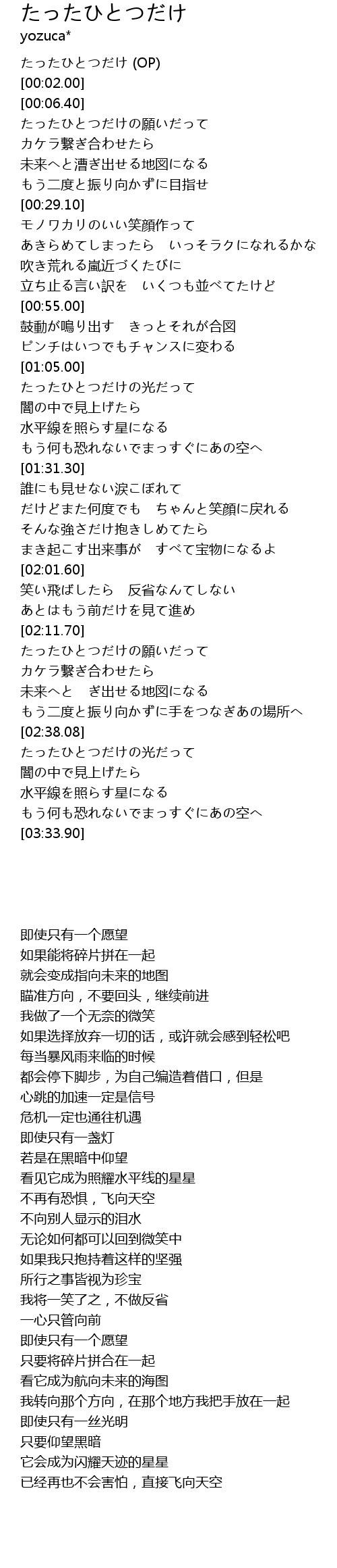 | [00:01.50] | たったひとつだけ (OP) |