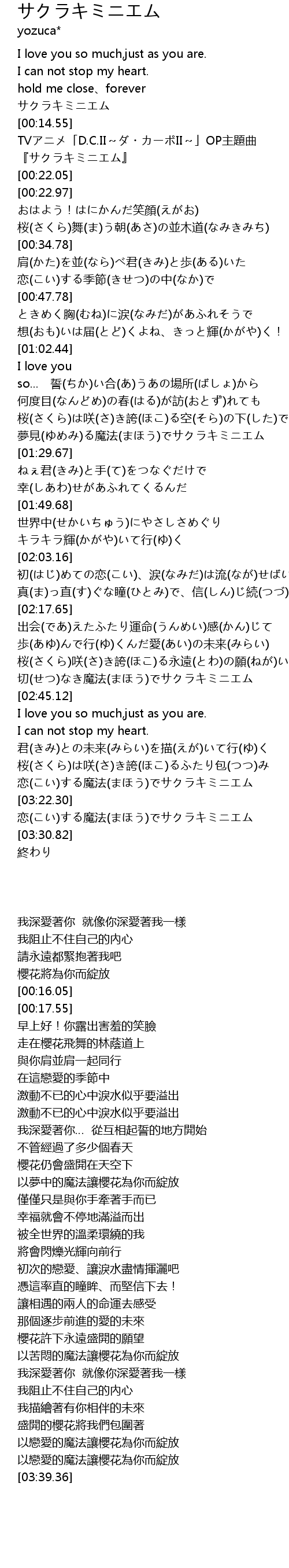 | [02:37.78] | 切(せつ)なき魔法(まほう)でサクラキミニエム |