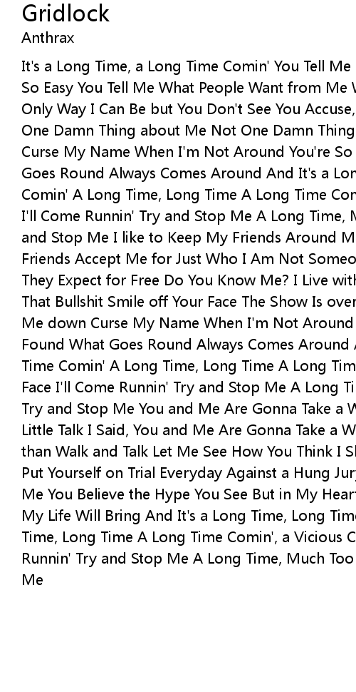 It's a Long Time, a Long Time Comin' You Tell Me How You Think I Should Be It's So Easy You Tell Me What People Want from Me Well I'll Just Be Myself It's the Only Way I Can Be but You Don't See You Accuse, Abuse Integrity You Don't Know One Damn Thing about Me Not One Damn Thing Build Me up and Then You Tear Me down Curse My Name When I'm Not Around You're So Hard until the Truth Is Found What Goes Round Always Comes Around And It's a Long Time, Long Time A Long Time Comin' A Long Time, Long Time A Long Time Comin', a Vicious Circle In Your Face I'll Come Runnin' Try and Stop Me A Long Time, Much Too Long And I'm Comin' Try and Stop Me I like to Keep My Friends Around Me Close But My Enemies Closer Friends Accept Me for Just Who I Am Not Someone I'm Supposed to Be Or Something They Expect for Free Do You Know Me? I Live with Myself, I Know My Place Wipe That Bullshit Smile off Your Face The Show Is over Build Me up and Then You Tear Me down Curse My Name When I'm Not Around You're So Hard until the Truth Is Found What Goes Round Always Comes Around And It's a Long Time, Long Time A Long Time Comin' A Long Time, Long Time A Long Time Comin', a Vicious Circle In Your Face I'll Come Runnin' Try and Stop Me A Long Time, Much Too Long And I'm Comin' Try and Stop Me You and Me Are Gonna Take a Walk I Think It's Time We Had a Little Talk I Said, You and Me Are Gonna Take a Walk And We're Gonna Do More than Walk and Talk Let Me See How You Think I Should Be You Think It's So Easy? Put Yourself on Trial Everyday Against a Hung Jury You Don't Know a Thing about Me You Believe the Hype You See But in My Heart God Knows I'll Be True To What My Life Will Bring And It's a Long Time, Long Time A Long Time Comin' A Long Time, Long Time A Long Time Comin', a Vicious Circle In Your Face I'll Come Runnin' Try and Stop Me A Long Time, Much Too Long And I'm Comin' Try and Stop Me |