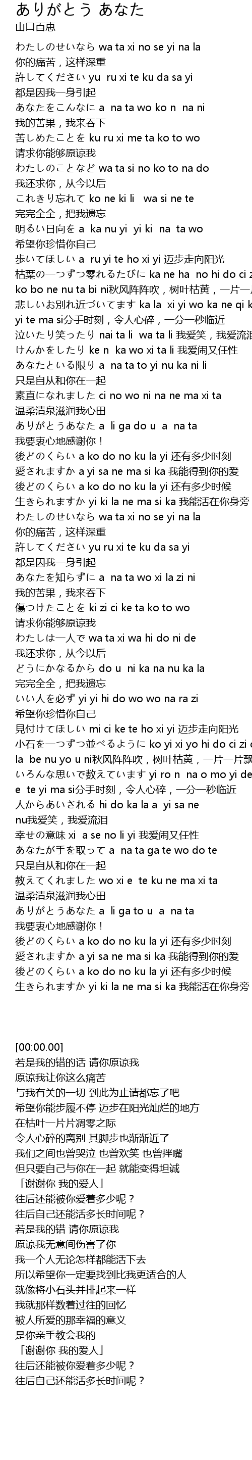 | [03:01.799] | ありがとうあなた a li ga to u a na ta 我要衷心地感谢你! |