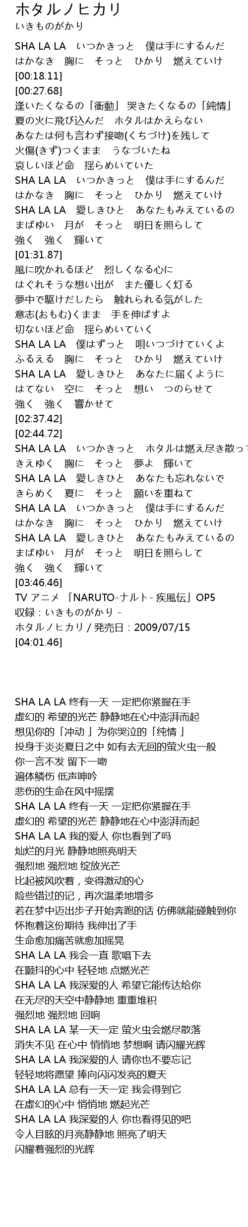 | [02:46.72] | SHA LA LA いつかきっと ホタルは燃え尽き散って |