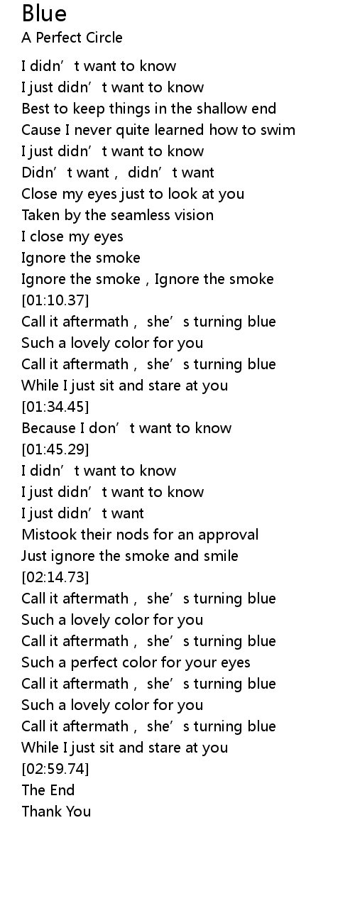 | [02:37.80] | Call it aftermath, she’s turning blue |
