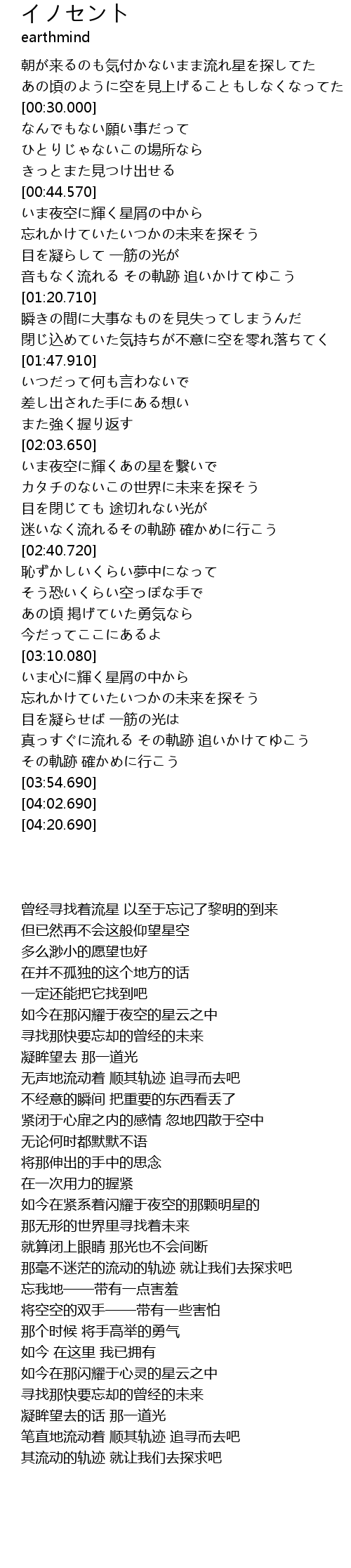 | [00:15.760] | 朝が来るのも気付かないまま流れ星を探してた |