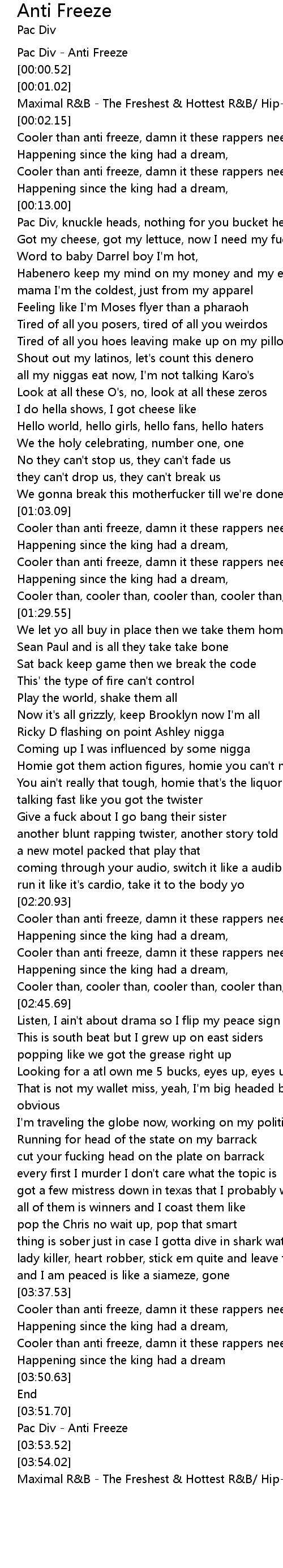 | [03:38.20] | Cooler than anti freeze, damn it these rappers need a better scene |