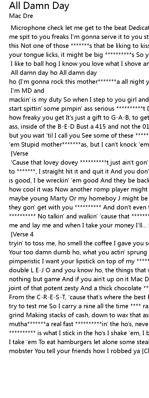 [Verse 1] Microphone check let me get to the beat Dedicated to you *******, let me spit to you freaks I'm gonna serve it to you straight a little something like this Not one of those *******s that be liking to kiss There's no telling what your tongue licks, it might be big **********s So you better try kissing on them other tricks 'Cause [? ] I like to ball hog I know you love what I shove and thrust up in your *******... All damn day [Chorus] All damn day ho All damn day ho (I'm gonna rock this mother*******a all night ya'll) All damn day ho All damn day ho (I'm gonna rock this mother*******a all night ya'll) [Verse 2] I'm MD and mackin' is my duty So when I step to you girl and tap you on your big booty And start spittin' some pimpin' ass serious **********t Don't even start trippin' on how freaky you get It's just a gift to G-A-B, to get to your P-A-D Bash in your ass, inside of the B-E-D Bust a 415 and not the 012 Now you fiending for more, but you wait 'til I call you See some of these *******s cold want you to jock 'em Stupid mother*******as, but I can't knock 'em I just wanna bash ho, and only get cash ho You want Dre to stay and lay, but I have to pass ho [Chorus] [Verse 3] 'Cause that lovey dovey **********t just ain't gon' get it When I pick you up to *******, I straight hit it and quit it And you don't trip because the sexin' is good, I be wreckin' 'em good And they be back in the hood Tellin' my cuddies how cool it was Now another romp player might give you a buzz Young C-U-R-T, or maybe young Marty Or my homeboy J might be your type of party Who ever it is, they gon' get with you ********** And don't even think they gon' sit with you ********** No talkin' and walkin' 'cause that **********t is funny style You pay me and lay me and when I take your money I'll... Spend that **********t all damn day [Chorus] [Verse 4] I'm hard but saucy ********** back on off me Steady tryin' to toss me, ho smell the coffee I gave you some ho, did not cum though Your too damn dumb ho, what you actin' sprung fo'? I'm hard to get with, pimperistic I want your lipstick on top of my ********** tip I'm from the V-A double L E-J O and you know ho, the things that we say Are simple and plain, nothing but game And if you ain't up on it Mac Dre is the name I want a fat ass joint of that potent zesty And a thick chocolate ********** whose name is Nestle From the C-R-E-S-T, 'cause that's where the best be Suckas get jealous and they try to test me So I carry a nine all the time **** raps I rhyme, this is how I grind Making stacks of cash, down to wax that ass A ******* ready to blast a mutha*******a real fast **********in' the ho's, never lickin' the ho's Big black ********** is what I stick in the ho's I shake 'em, I break 'em, but never will I take 'em To eat hamburgers let alone some steak and Lobster, 'cause baby I'm a mobster You tell your friends how I robbed ya [Chorus] |