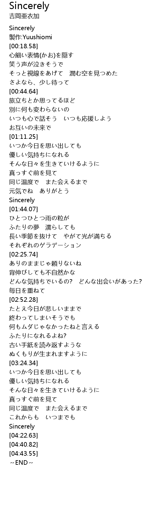 | [00:30.28] | そっと視線をあげて 潤む空を見つめた |